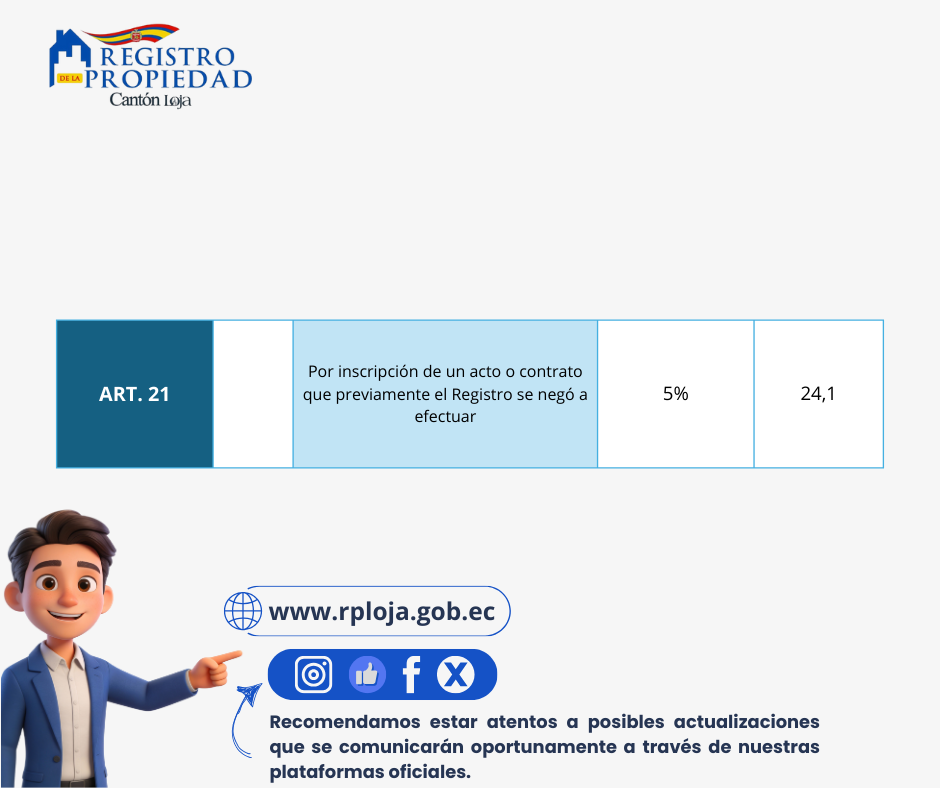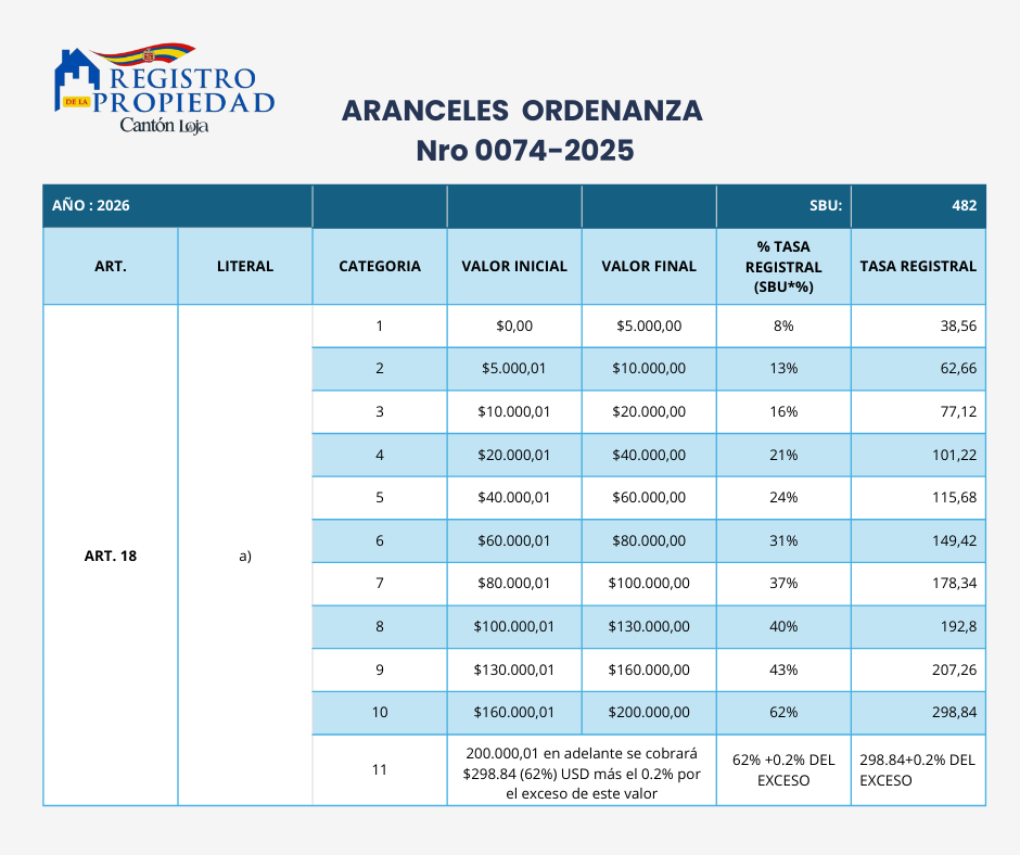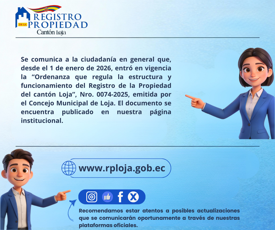 Se comunica a la ciudadanía en general que, desde el 1 de enero de 2026, entró en vigencia la “Ordenanza que regula la estructura y funcionamiento del Registro de la Propiedad del cantón Loja”, Nro. 0074-2025, emitida por el Concejo Municipal de Loja. El documento se encuentra publicado en nuestra página institucional.
